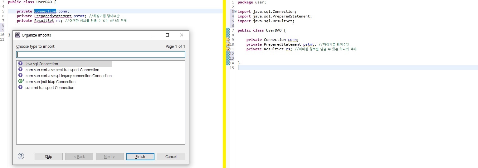 2. java sql.connection 외부라이브러리를 추가 및 mysql 접속하도록 객체생성 한다.