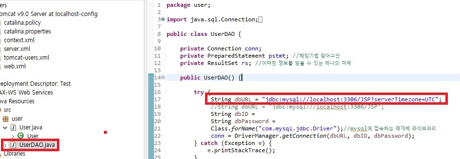 ->String dbURL = "jdbc:mysql://localhost:3306/JSP?serverTimezone=UTC";