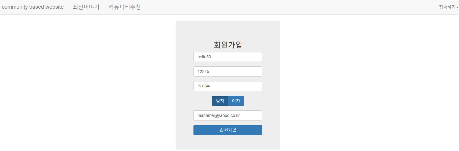 2. 회원가입 양식에서 작성완료후 회원가입 버튼을 누르면 다음처럼 화면이 뜬다.