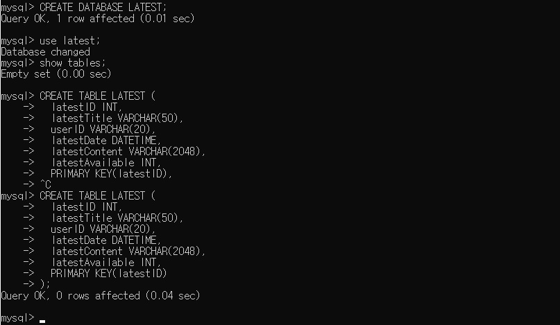 1. mysql에 접속해서 latest(커뮤니티발견/게시판)데이터베이스 테이블을 만들어준다.