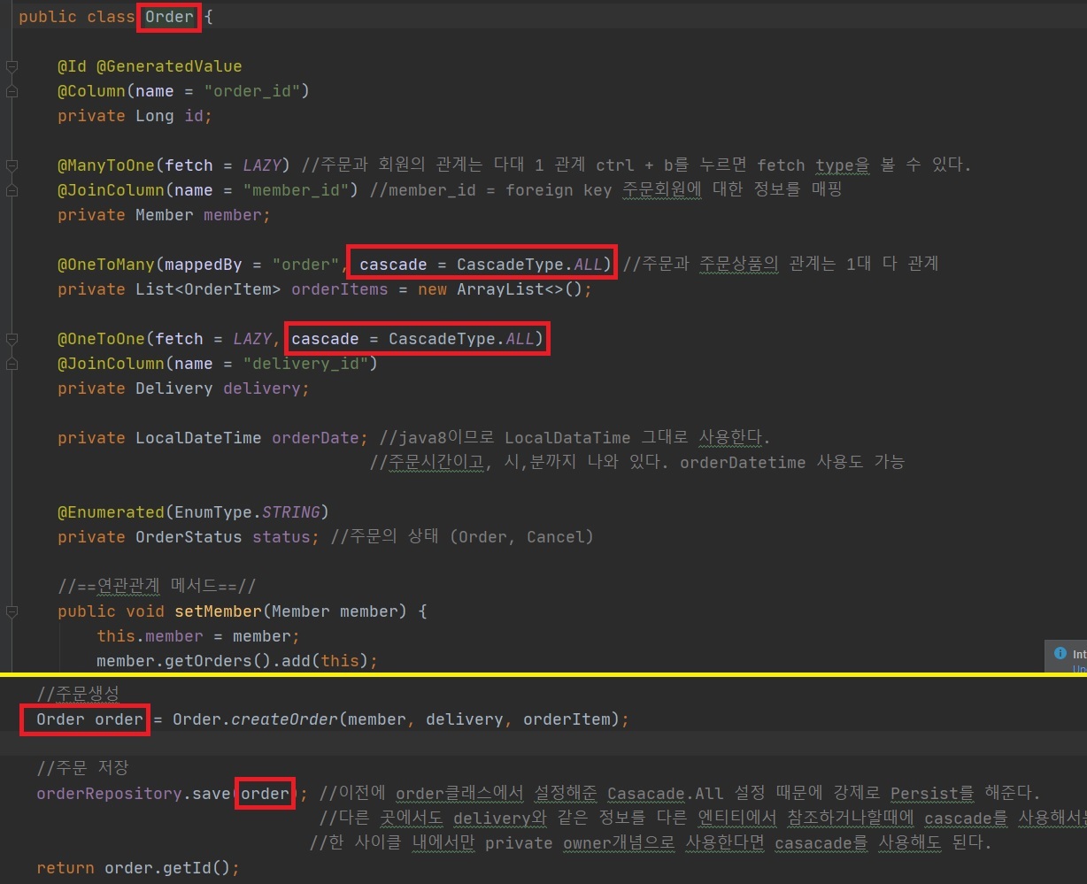 -이전에 order클래스에서 설정해준 Casacade.All 설정 때문에 강제로 Persist를 해준다.