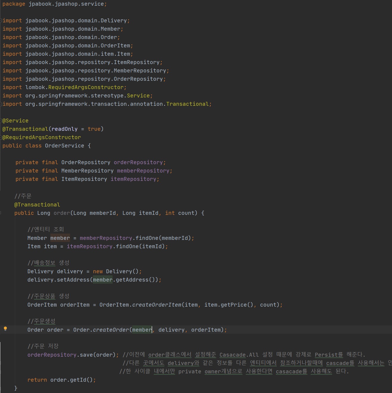 -findOne으로 member,item 엔티티조회를 한다. 이것 때문에 의존관계를 넣었다.