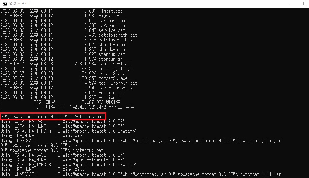 cmd에서 해당경로에서 startup.bat 명령어를 엔터후 실행시킴으로