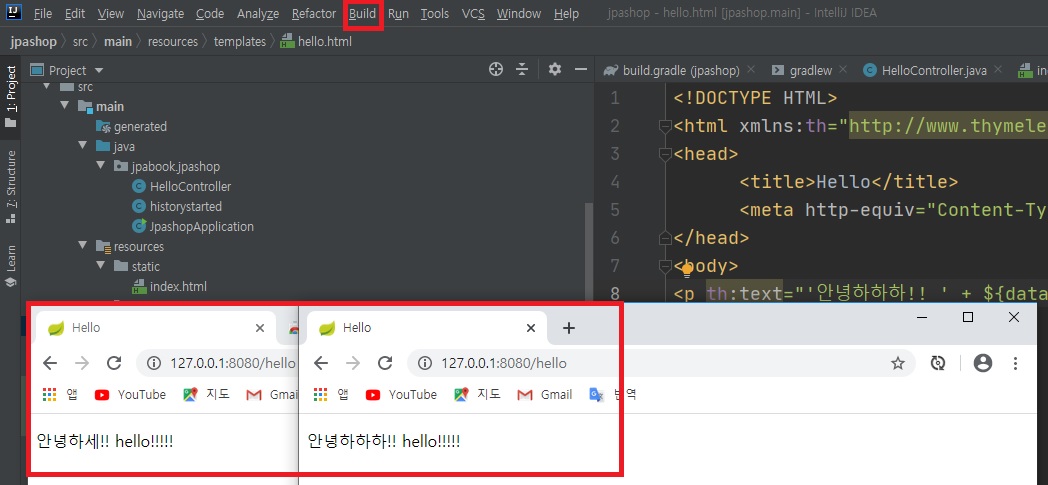 스프링부트메인파일이 있는 jpabook.jpashop으로 Hello.Controller파일을 이동